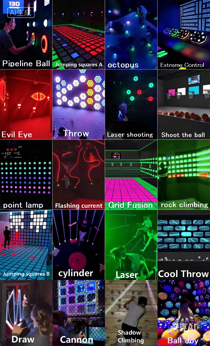 Laser mazes, climbing walls, puzzle rooms, etc.